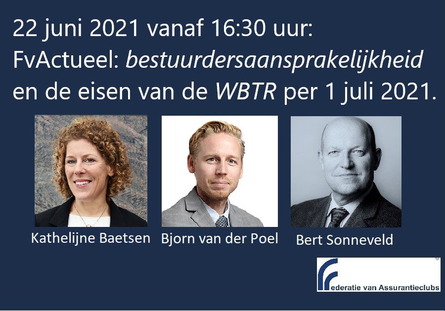 Op 22 juni 2021 vanaf 16:30 uur organiseert de Federatie van Assurantieclubs het webinar ‘#FvActueel: bestuurdersaansprakelijkheid en de eisen van de WBTR per 1 juli 2021’. Voorzitter van de Federatie, Bert Sonneveld, ontvangt Kathelijne Baetsen, advocaat/partner van Stadermann Luiten Advocaten, en Bjorn van der Poel, manager bestuurdersaansprakelijkheid bij Markel Insurance.